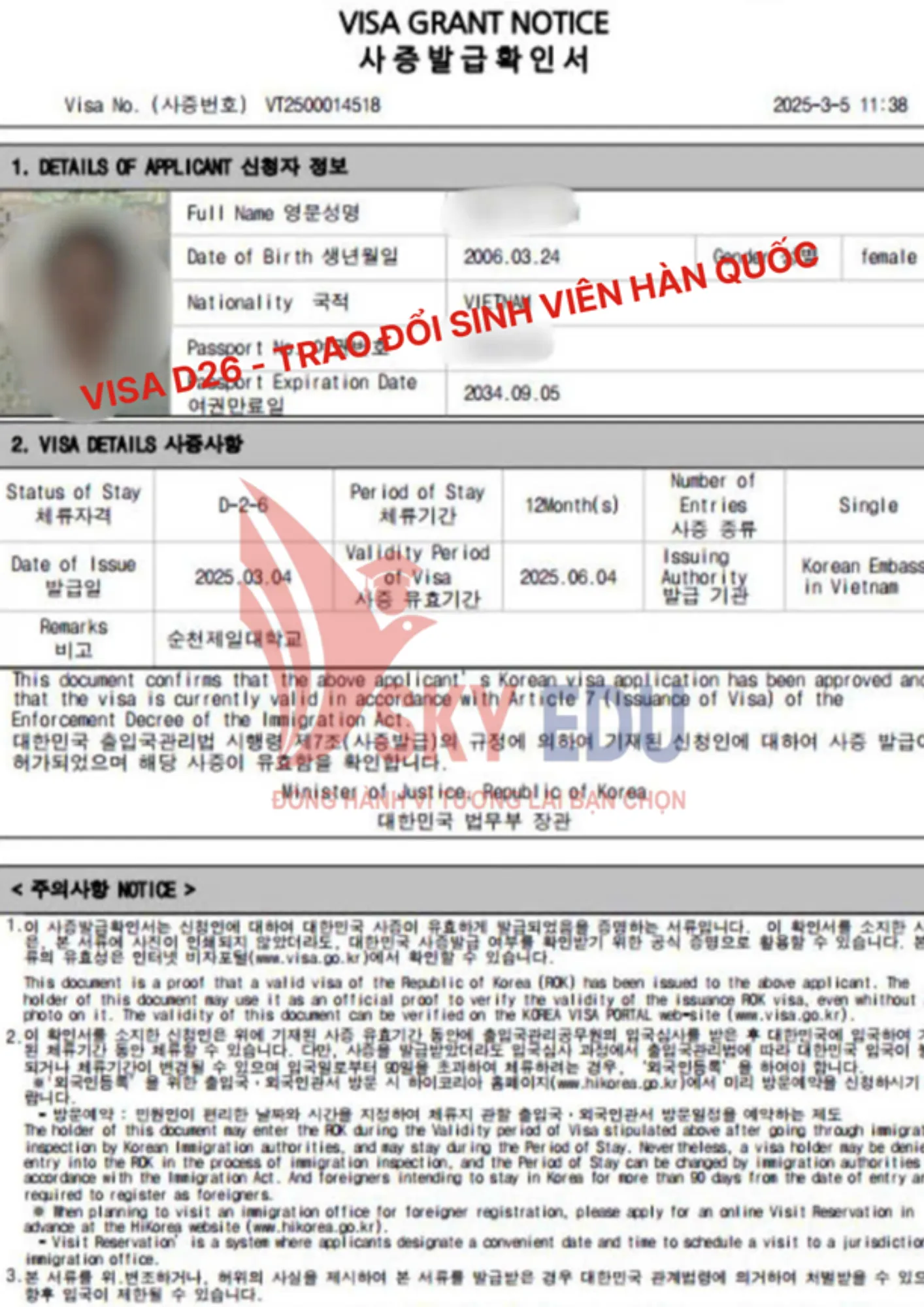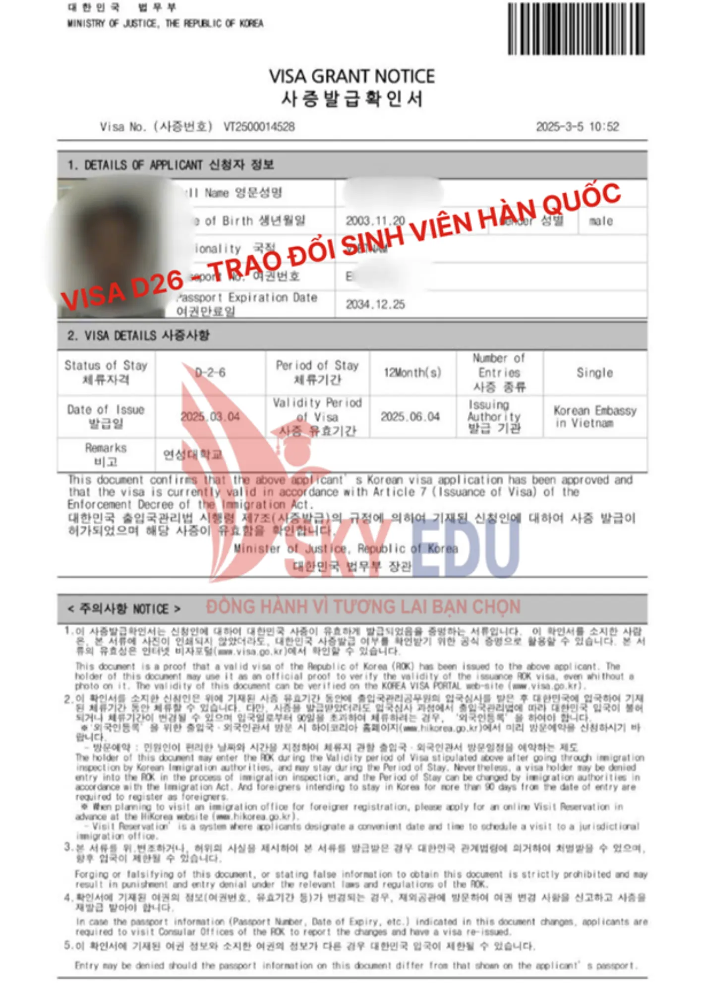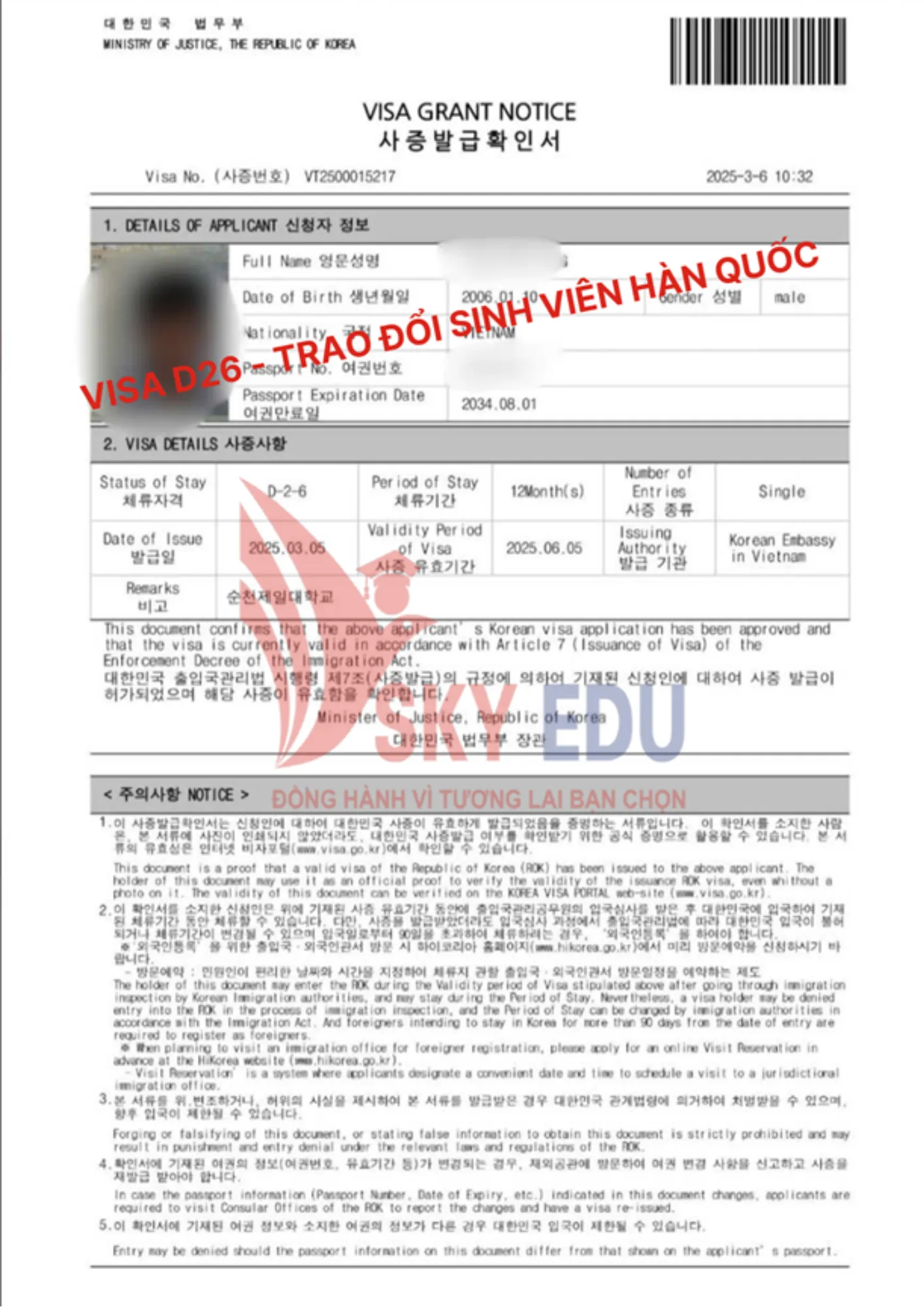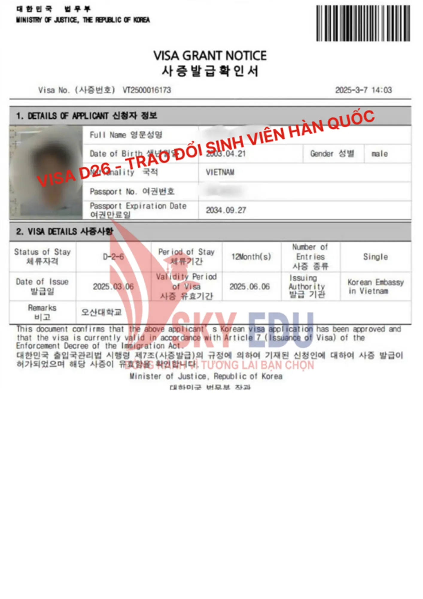 Visa D2-6 là visa du học hệ Cao đẳng/ Đại học chính quy tại Hàn Quốc, áp dụng cho học sinh tham gia chương trình trao đổi sinh viên giữa Việt Nam và Hàn Quốc.